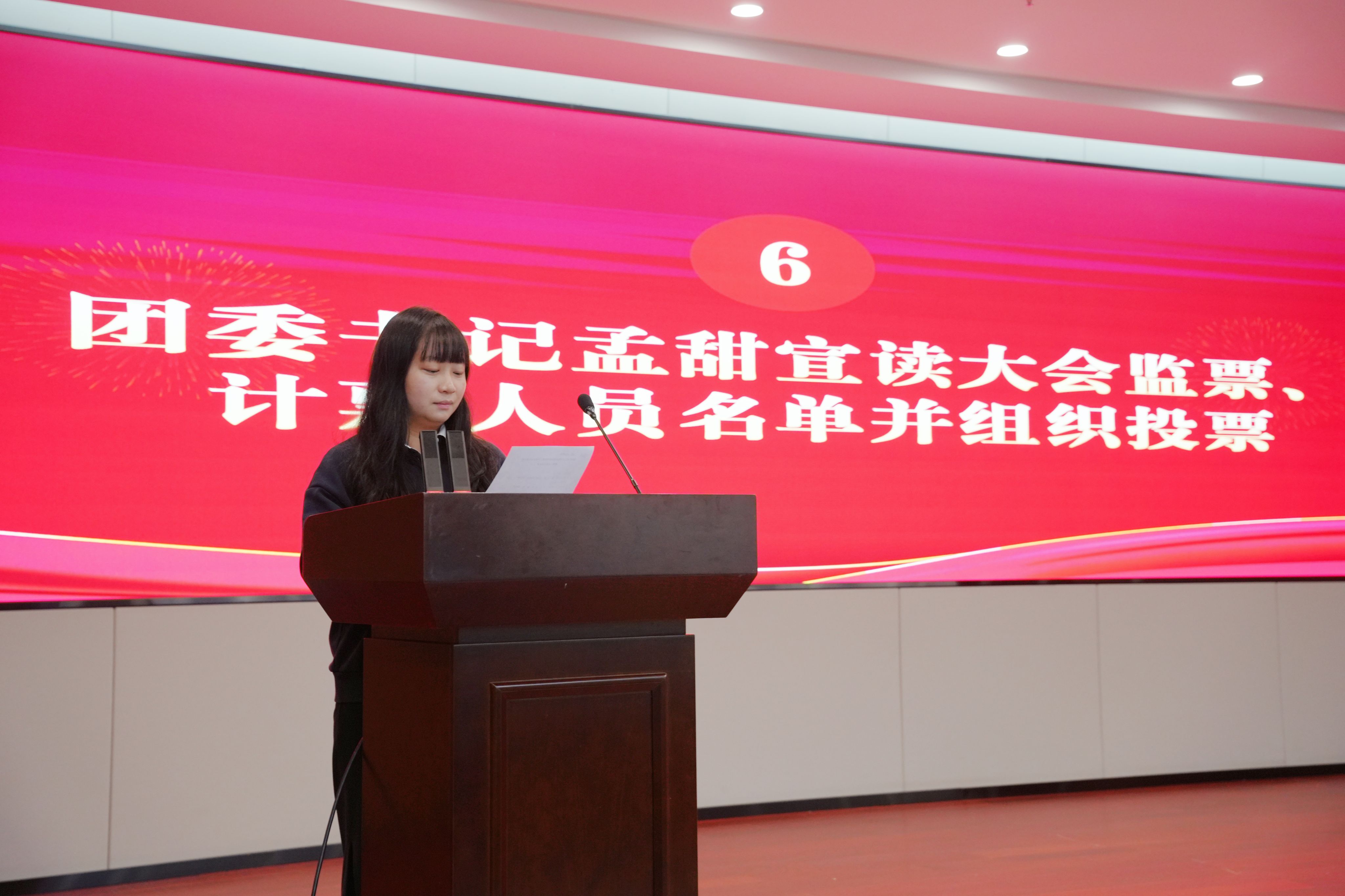 在竞选环节,第二十届主席团候选人依次登台,以饱满的热情发表竞选演讲,展现出新时代青年学子的责任与担当。紧接着,彭彦涛宣读大会选举办法,团委书记孟甜宣读监票、计票人员名单并组织现场投票工作。现场秩序井然,投票过程公开透明。随后,涂瑞宣读志愿服务倡议书,呼吁全体学子积极投身志愿服务,传递青春正能量。辅导员曹珍珠当场宣布投票结果及第二十届学生会主席团成员名单,现场响起热烈掌声。大会最后,全体参会人员重温入团誓词,铮铮誓言彰显青春担当,大会在全体合影留念中圆满落下帷幕。