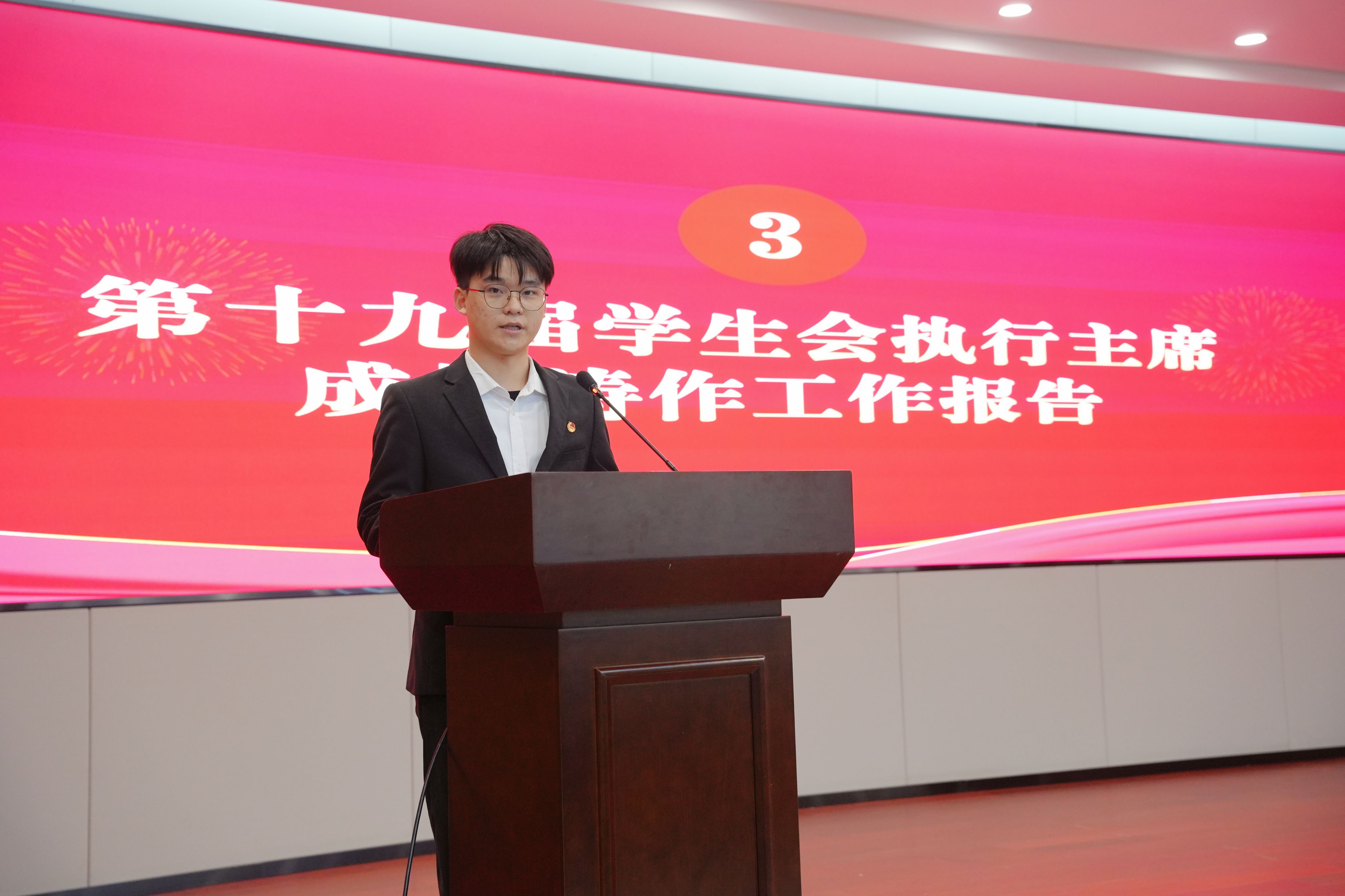 伴随着庄严的国歌声,大会正式拉开帷幕。学院党委副书记张倩发表致辞,她充分肯定了第十九届学生会的工作成效,并对新一届学生会的发展提出殷切期望。随后,第十九届学生会执行主席成林涛作工作报告,全面回顾了过去一段时间的工作成果,同时对未来的工作方向进行了清晰规划。