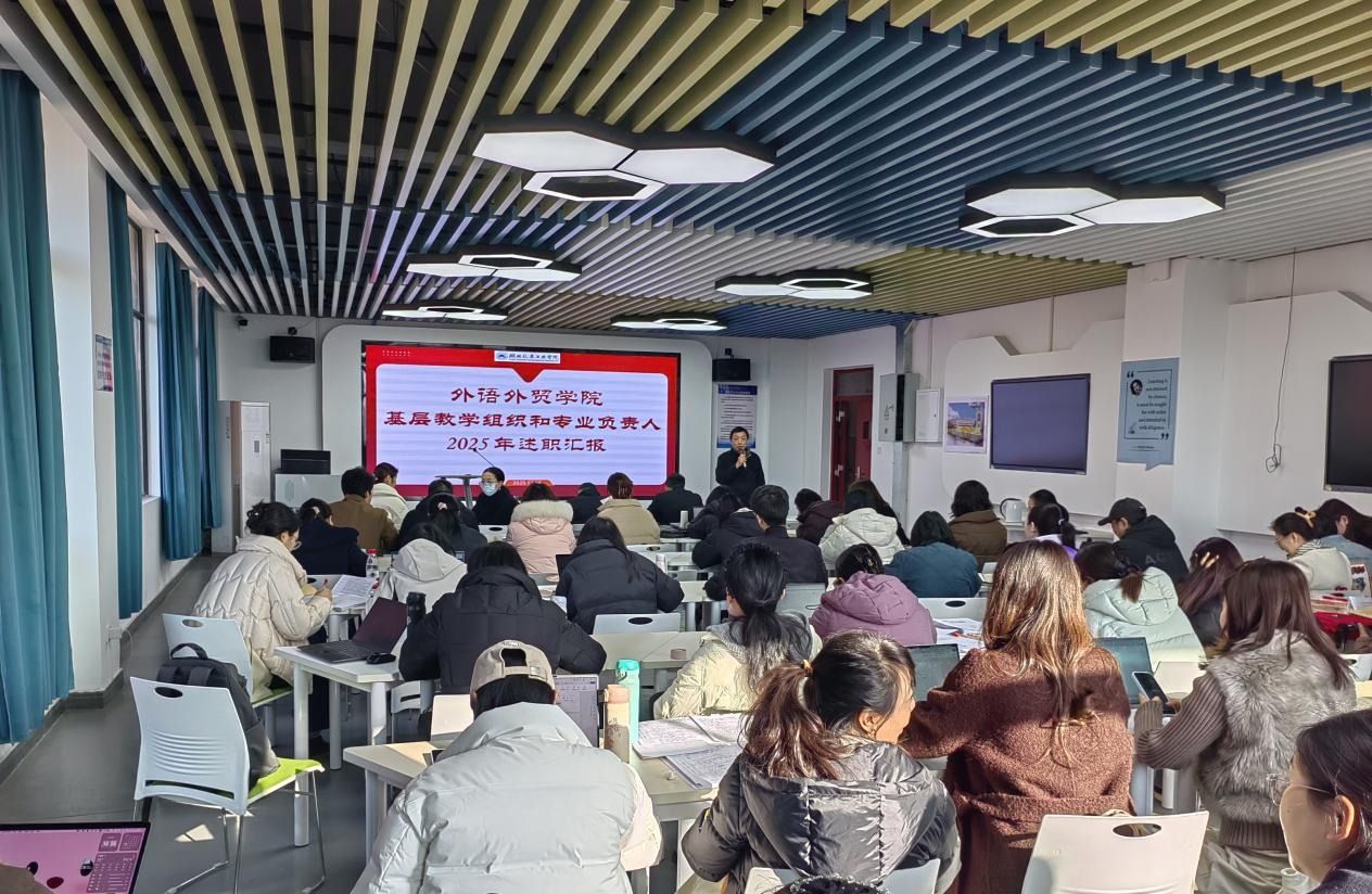 本网讯(文/图 龚建强)12月15日,外语外贸学院成功举办基层教学组织与专业负责人年度述职汇报会,全面总结年度教学工作成效,梳理教学建设中的经验与不足,明确新一年发展方向。学院领导班子、全体教职工参会,各基层教学组织负责人及专业负责人依次登台述职,副院长王辰晖主持会议。