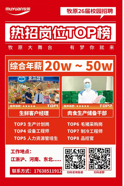 生产储备干部、机械工程师、电气工程师、生产计划岗、毛猪采购岗、生鲜客户经理、 🎈【超大平台】上市公司、中国500强、民营企业第67位、市值2000亿+、13万员工、年营收1379亿、净利润179亿!
